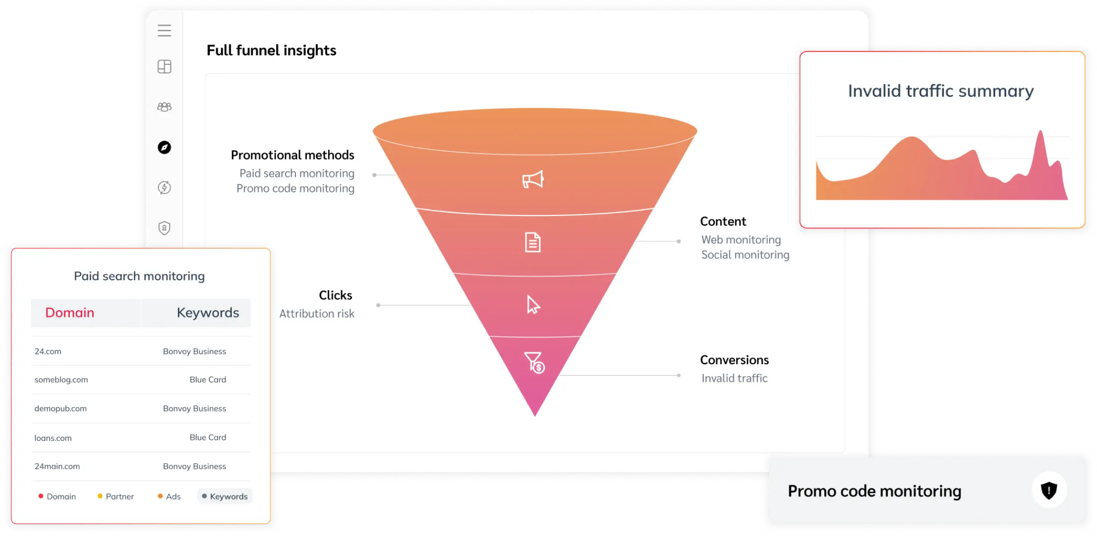 Fortify your partnerships with full-stack protection across the entire consumer journey. Automate the daily monitoring and remediation of issues that could result in partner non-compliance. Expose affiliate fraud, influencer fraud, and traffic abnormalities wherever they corrupt your conversion paths. Cut out invalid traffic and reinvest spend in high-quality partnerships.